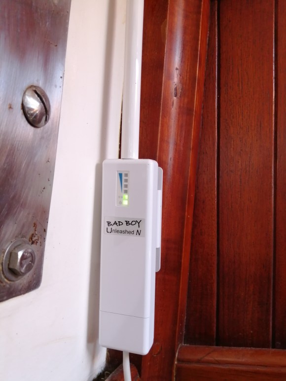 The Bad Boy is a WiFi extender and router system that we use to pick up WiFi signals on shore. Depending on where we are anchored, we can sometimes have fast, flawless WiFi signal or excruciatingly slow dial-up speed signal. Either way, it’s great for emails and occasional internet browsing from the boat.