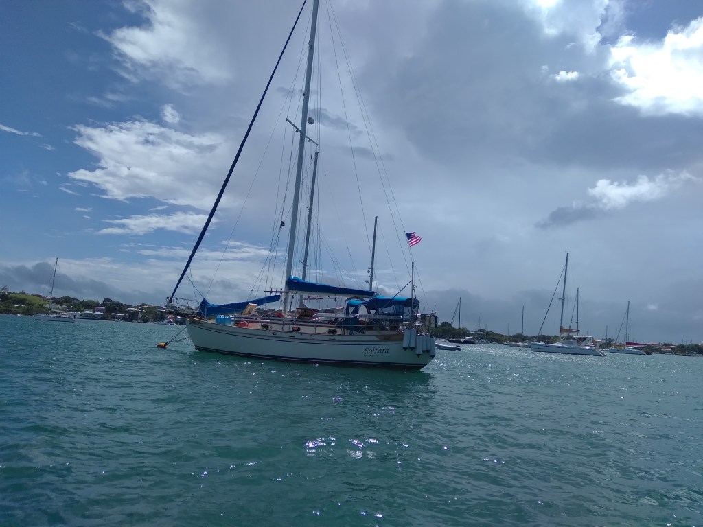 Soltara splashed in early July and we have been on a mooring in Prickly Bay ever since. We’ve been working on some fairly big projects and—you guessed it!—waiting on parts. Seems to be the story of our lives!