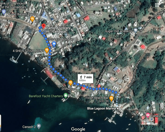 The staff at the marina was very friendly, answered our questions and after they explained to us where we could find a grocery store, we went for short walk down the road to the little village of Calliaqua. The road was embellished with tropical foliage that would often part to display picturesque views of blue waters.